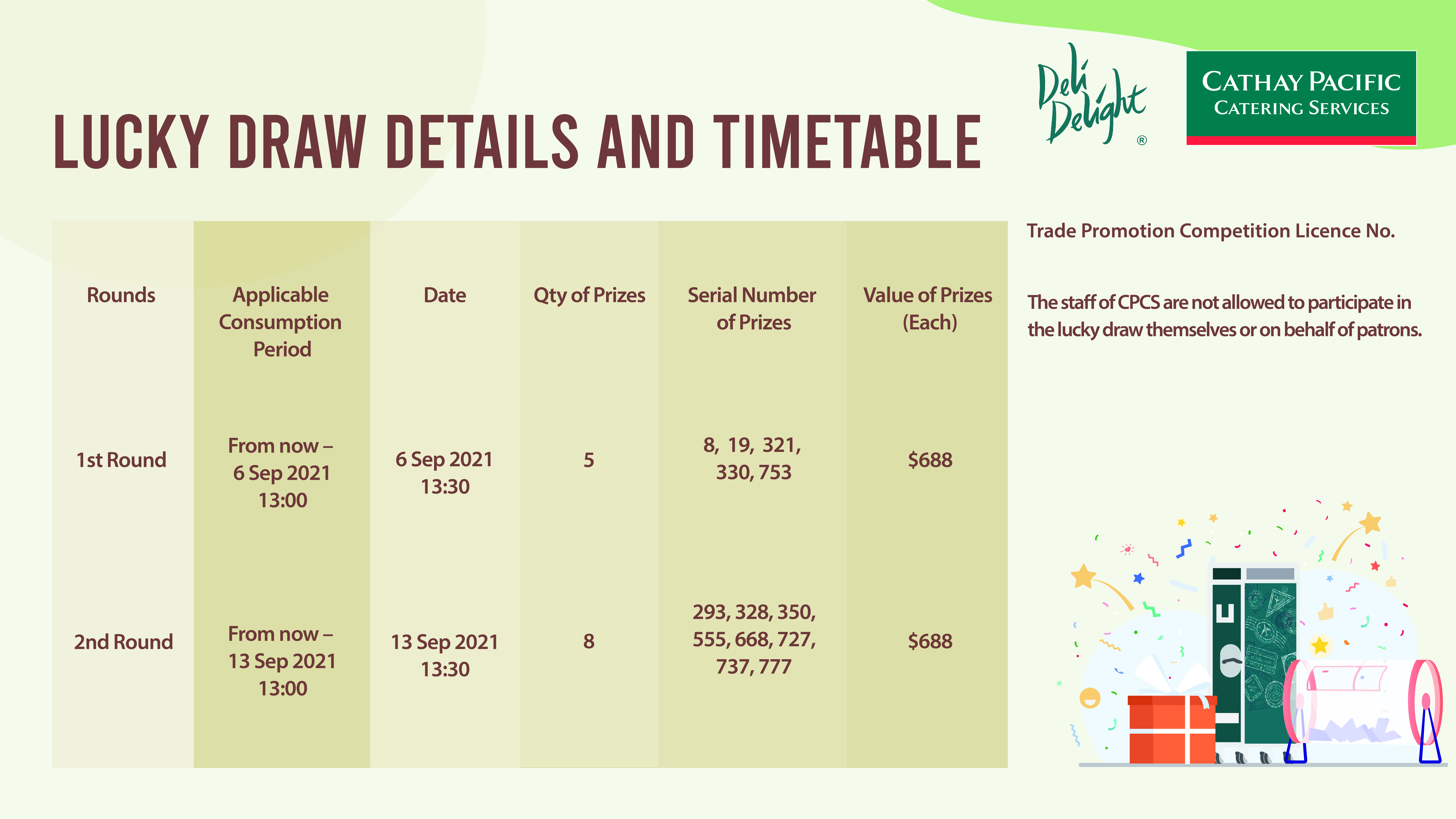 Lucky draw dates and times are as follows: